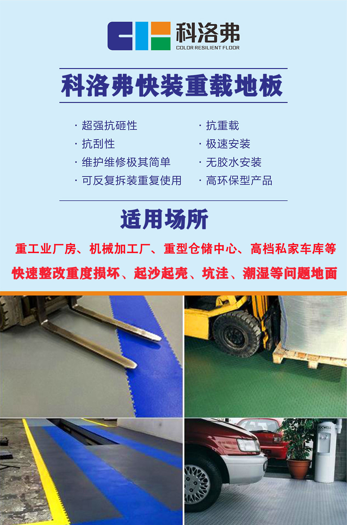 車間地板比較爛怎么辦?爛地面修補(bǔ)翻新多少錢一平米? 車間爛地板坑坑洼洼怎樣修補(bǔ)?針對(duì)爛水泥地坪起砂、凹凸不平、裂縫、污漬、腐蝕等進(jìn)行各類舊地面翻新需要哪些材料?科洛弗采用研發(fā)配方先進(jìn)制造技術(shù),專業(yè)生產(chǎn)快裝重載工業(yè)地板,被廣泛使用于工業(yè)廠房車間環(huán)氧樹脂地坪及油漆地面的破損修復(fù)翻新,使用更加靈活高效。重型耐磨、耐重壓、耐承重,讓地面不易磨損。維護(hù)成本低廉,更易維護(hù),磨損破損工廠地面及倉庫地面更易修補(bǔ),局部維護(hù)更加便捷方便